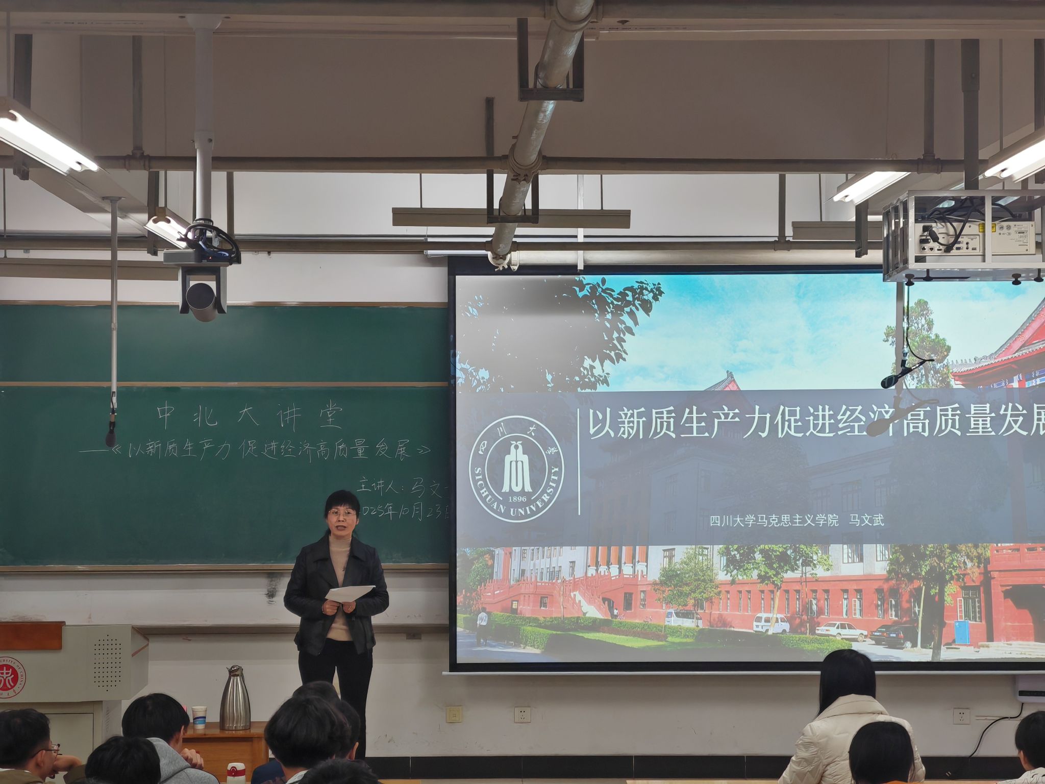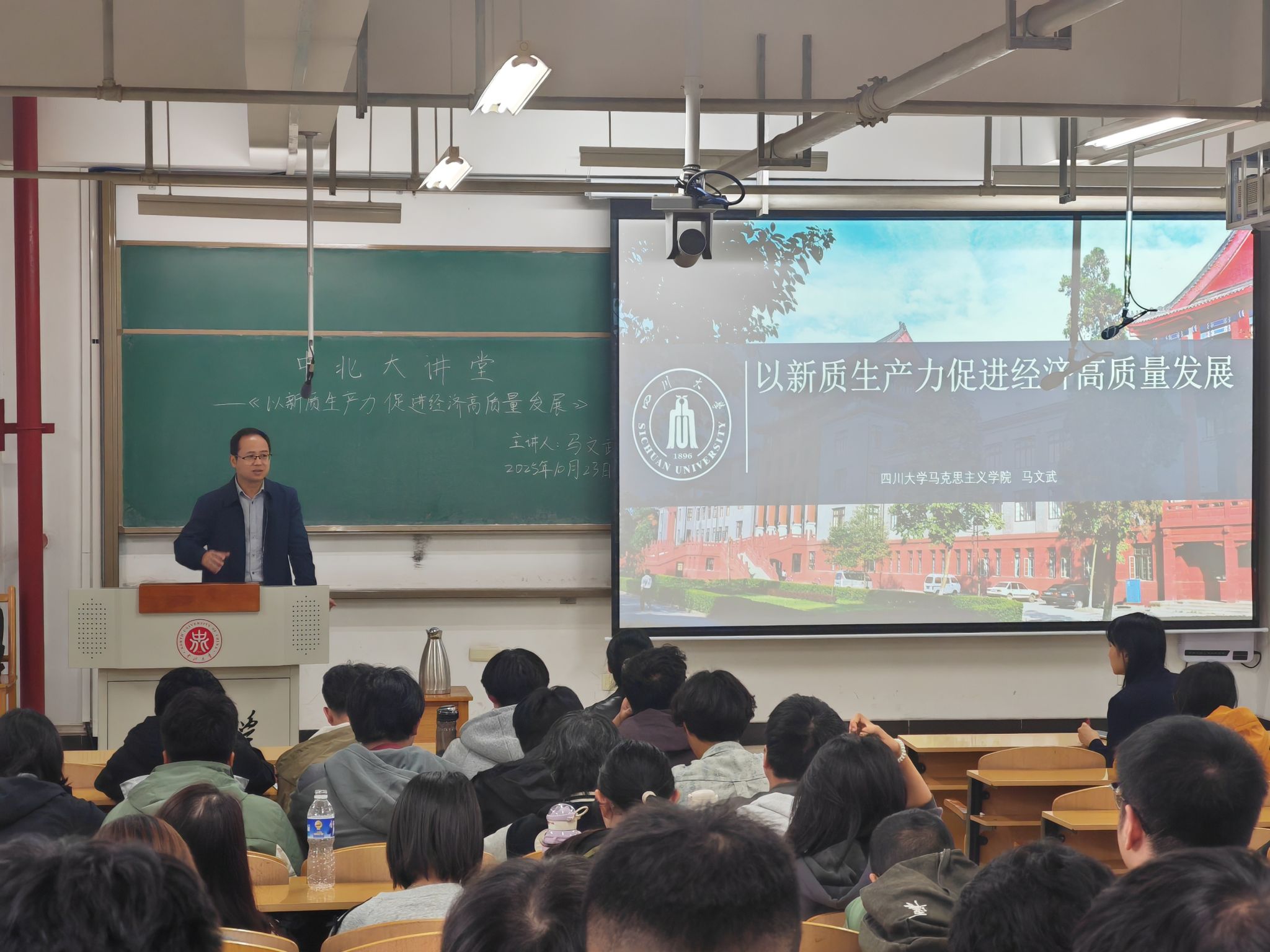 2025年10月23日下午四点,经济与管理学院在15206H教室顺利举办以“以新质生产力促进经济高质量发展”为主题的中北大讲堂。本次讲座特邀四川大学马克思主义学院院长助理、马克思主义中国化教研室主任马文武教授主讲。本次讲座由经济与管理学院党委书记杜苇主持。