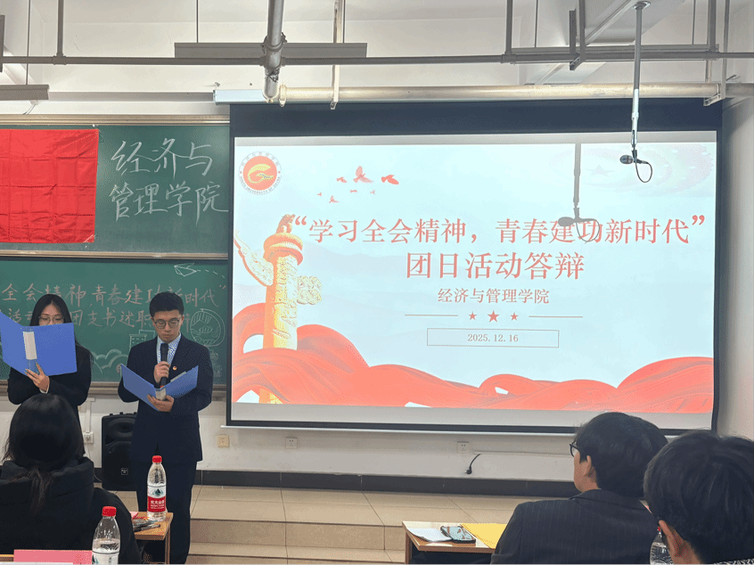 凝聚青春力量,砥砺奋进征程。为全面总结基层团支部工作成果,检验团日活动开展成效,激发团干部履职尽责、服务青年的内生动力,进一步夯实共青团基层组织建设,经济与管理学院团委于2025年12月16日在15306教室成功举办了“学习党的二十届四中全会精神,青春建功新时代”团支书团日述职答辩活动。