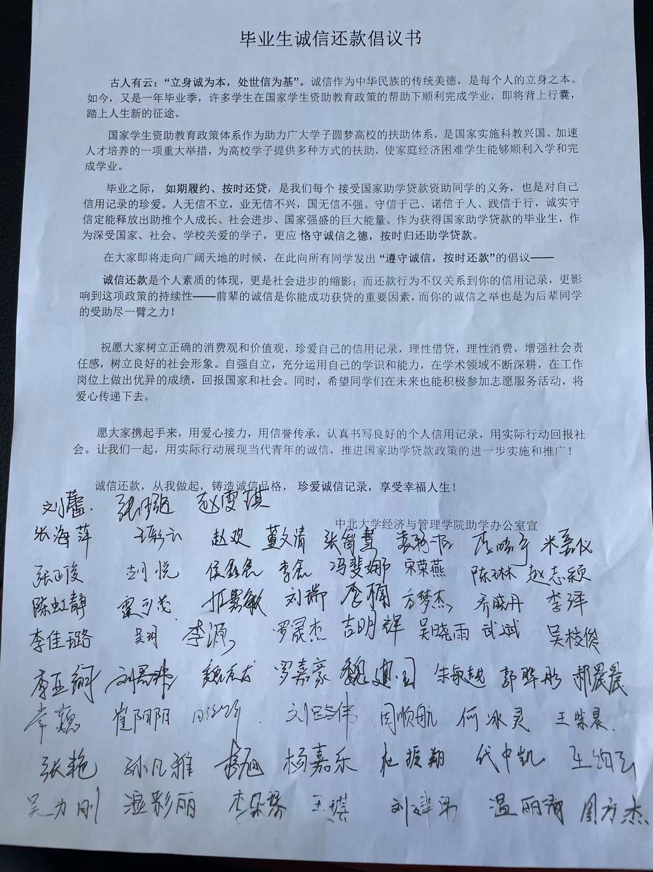 高校资助制度建设,不断加大资助工作力度,使广大学生尤其是家庭经济困难学生都充分享有公平接受高等教育的权利,从制度上基本解决了高校家庭经济困难学生的就学问题。助学到款是信用贷款,学生不需要办理贷款担保或抵押,但需要承诺按期还款,并承担相关的法律责任。助学贷款利率按照中国人民银行公布的利率和国家有关利率政策执行。贷款学生在校期间的国家助学贷款利息全部由财政补贴,毕业后的利息由贷款学生本人全额支付。学生根据个人毕业后的就业和收入情况,在毕业后的1-2年内选择开始偿还本金的时间,六年内还清贷款本息。助学贷款的借款学生如未按照与经办银行签订的还款协议约定的期限、数额偿还贷款,经办银行将对其违约还款金额计收利息,严重违约的贷款人还将承担相关的法律责任。活动结尾,所有毕业生确认了诚信资助表上的信息,签字并按手印交回了助学贷款信息毕业确认表。