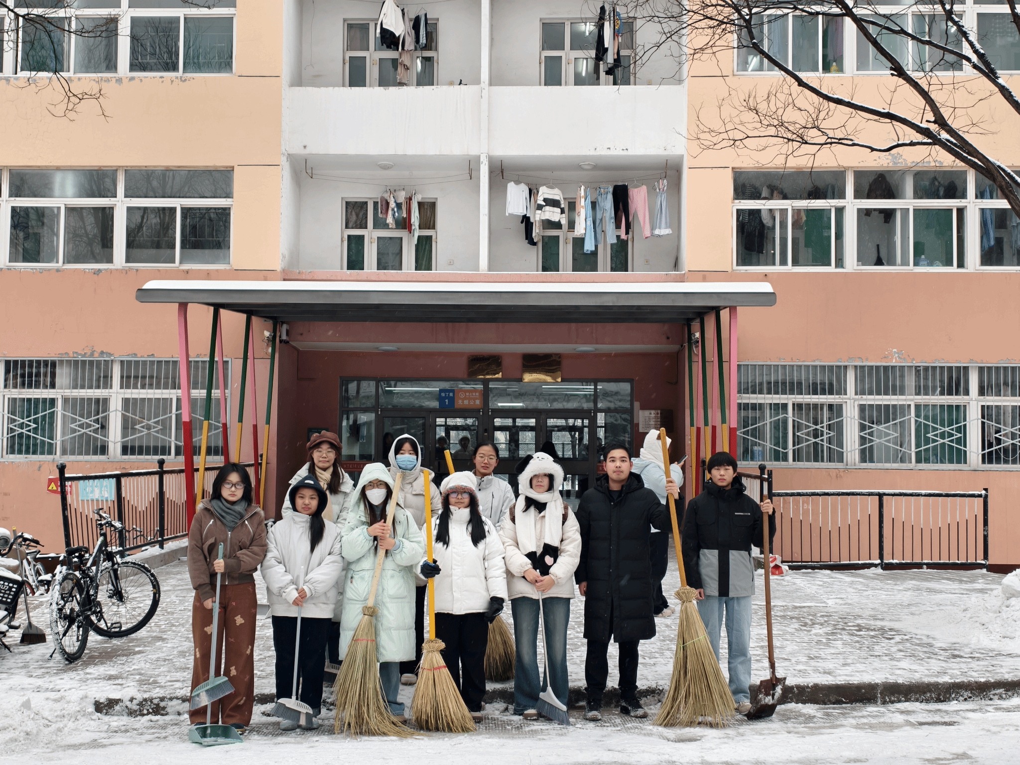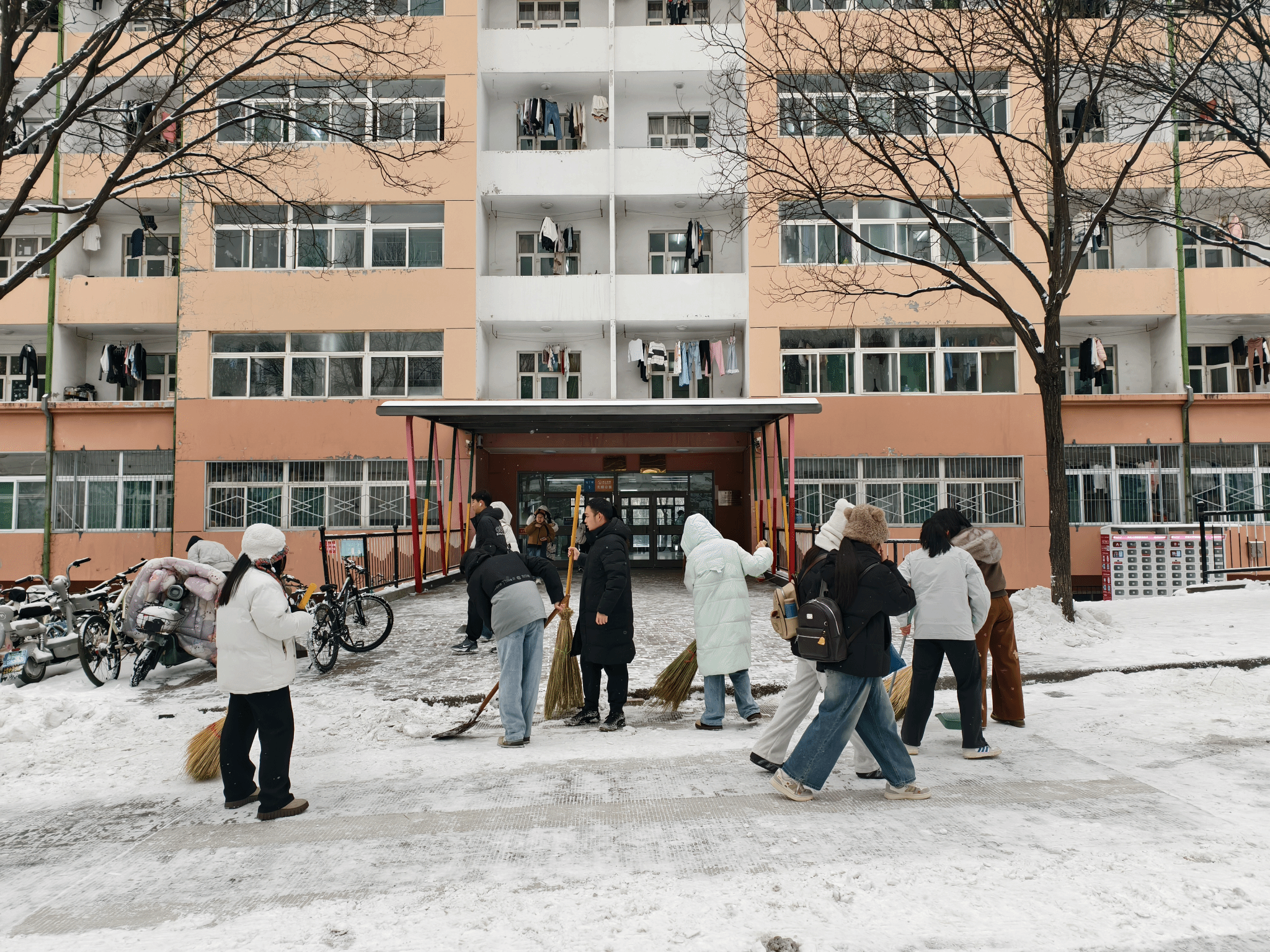 勤工助学部组织同学们早早集合,前往怡丁苑一号楼清扫宿舍楼前主干道,随后在经济与管理学院院楼前重点清理教学区域入口积雪。活动开始前,负责人详细分配任务,强调安全注意事项,并鼓励大家以饱满的热情投入劳动。“既要高效完成除雪任务,也要注意保暖和安全”,简短的动员点燃了同学们的积极性,大家手持扫帚、铁锹、簸箕等工具,化身“除雪先锋”,在雪地中忙碌起来。同学们分工明确、配合默契,避免积雪冻滑造成安全隐患,一位参与的同学笑着说:“虽然手冻得通红,但看到干净的路面,心里特别暖!”。