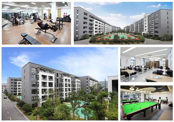 ② 娱乐休闲生活设施:便利超市、洗衣房、生活餐厅、图书馆、影剧院、篮球场、羽毛球场、健身房、台球室、乒乓球室等。