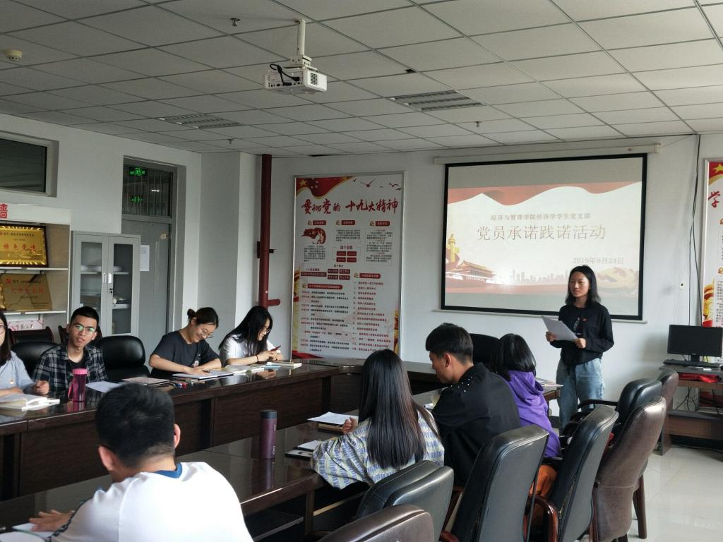为深入学习贯彻习近平新时代中国特色社会主义思想,进一步强化我院学生党员的党员意识、责任意识和服务意识,引导学生党员在学习、工作和生活中发挥先锋模范作用,2019年9月24日下午5点30在经管院308党员之家,经济学学生党支部开展“党员承诺践诺”活动。本次活动由党支部书记李爱霞老师主持,全体党员参加。
