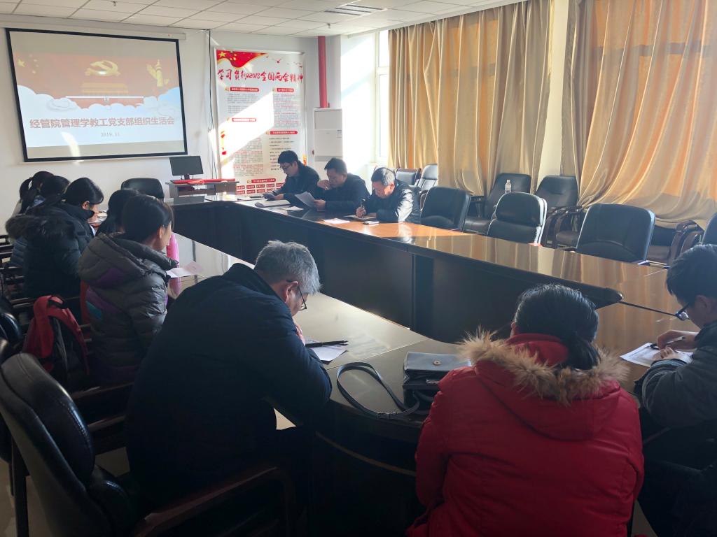 根据学校学院“不忘初心、牢记使命“主题教育系列活动要求和《关于基层党组织召开“不忘初心、牢记使命”主题教育专题组织生活会和开展民主评议党员的通知》,12月3日下午,经济与管理学院党委管理学教工党支部召开组织生活会。经济与管理学院联系院领导赵公民院长出席指导,支部党员积极参会。为开展好本次组织生活会,根据院党委部署,管理学教工党支部紧密围绕”不忘初心“开展了红色革命教育、承诺践诺、志愿服务等前期活动,做好了会前学习、集中讨论、谈心谈话、问题查摆等前期工作,做到活动有内容、有体会、有创新,做到学习和工作有意义、有深度、有成效。