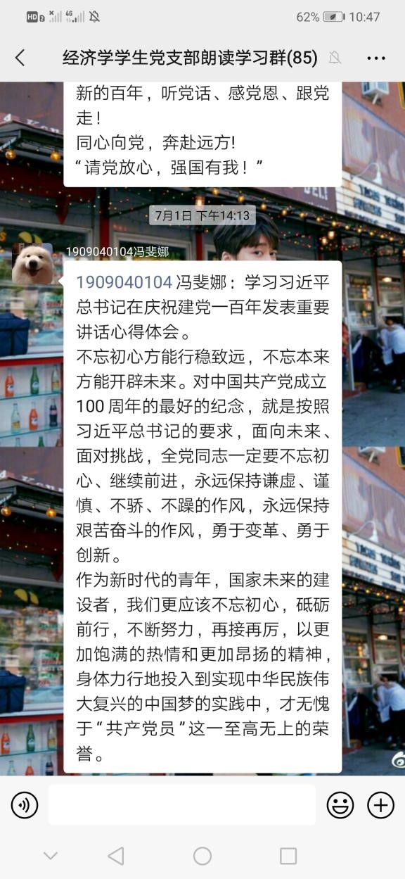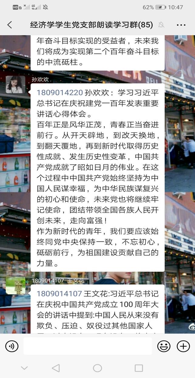 7月1日,经济学学生党支部全体党员线上开展第七次党史专题学习讨论,本次讨论以习近平总书记在庆祝建党100周年大会上的重要讲话精神为主题。