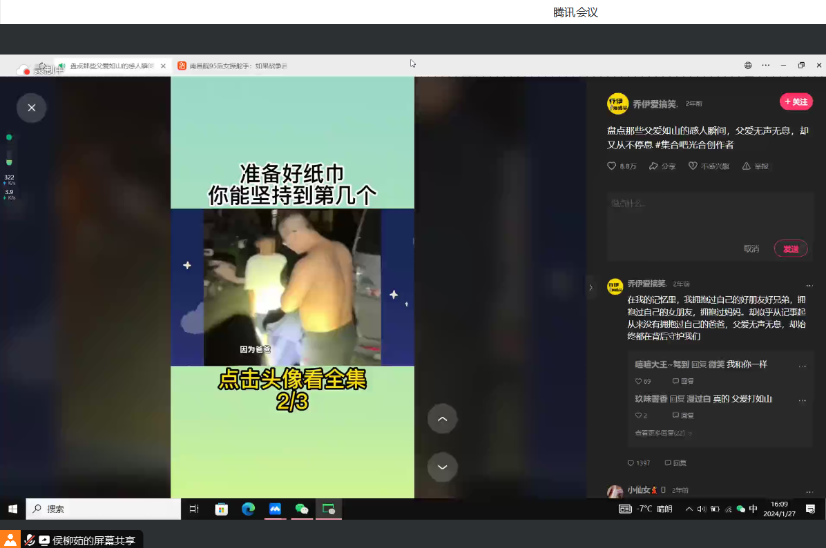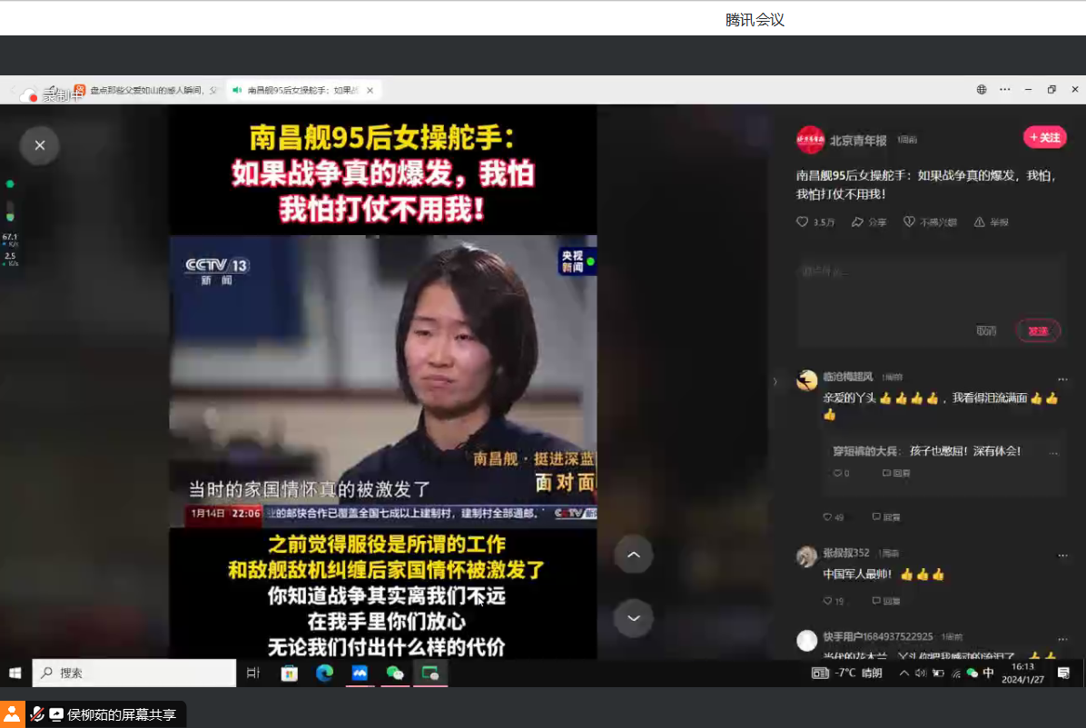 2024年1月27日下午五点,经济与管理学院研究生党支部集体于腾讯会议观看“感动瞬间”视频,展现父爱的无声无息以及南昌舰95后女操舵手徐文茜的爱国热忱和精神力量。