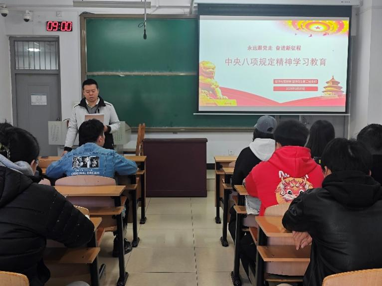 随后,党支部书记孙瑞系统解读了中央八项规定的具体内容,强调其作为党中央改进工作作风、密切联系群众的重要抓手,聚焦“精简会议活动”“规范出访接待”等八项具体要求,是全面从严治党的重要制度基础。接着,他深入阐释了“中央八项规定精神”的延伸内涵,指出其不仅涵盖八项规定原文,更体现了党持之以恒正风肃纪的政治决心,是新时代作风建设的行动指南。最后通过案例分析,使与会党员清晰认识到,规定是具体条款,精神是实践要求,二者互为表里,共同构成作风建设长效机制。