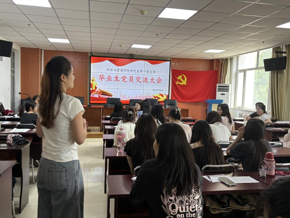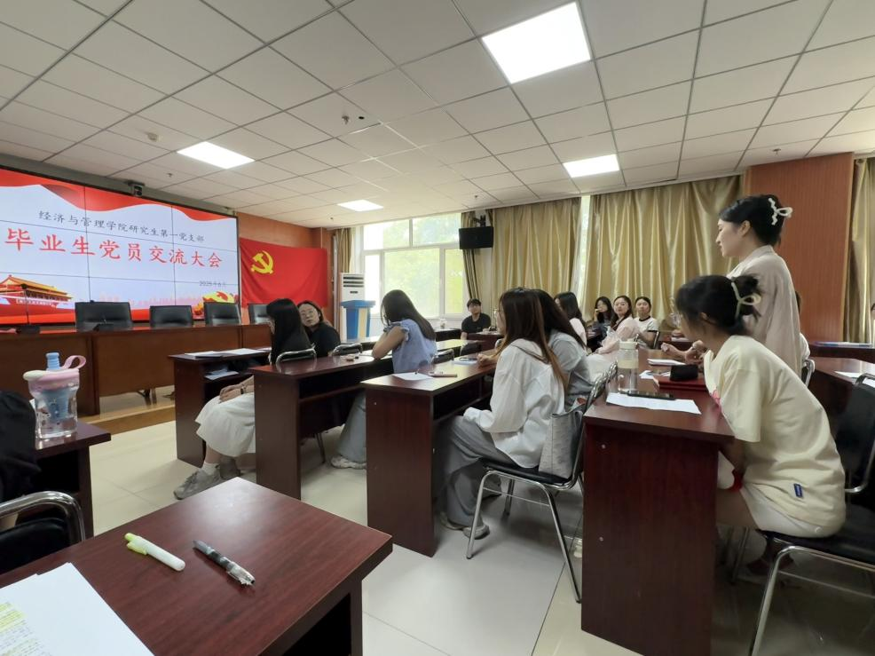 6月13日下午2点15分经济与管理学院研究生第一党支部于逸夫楼南楼301,召开毕业生党员交流会,此次会议由支部书记买璐璐主持,全体党员齐聚一堂,共同开启这场充满智慧与温情的经验传承之旅。