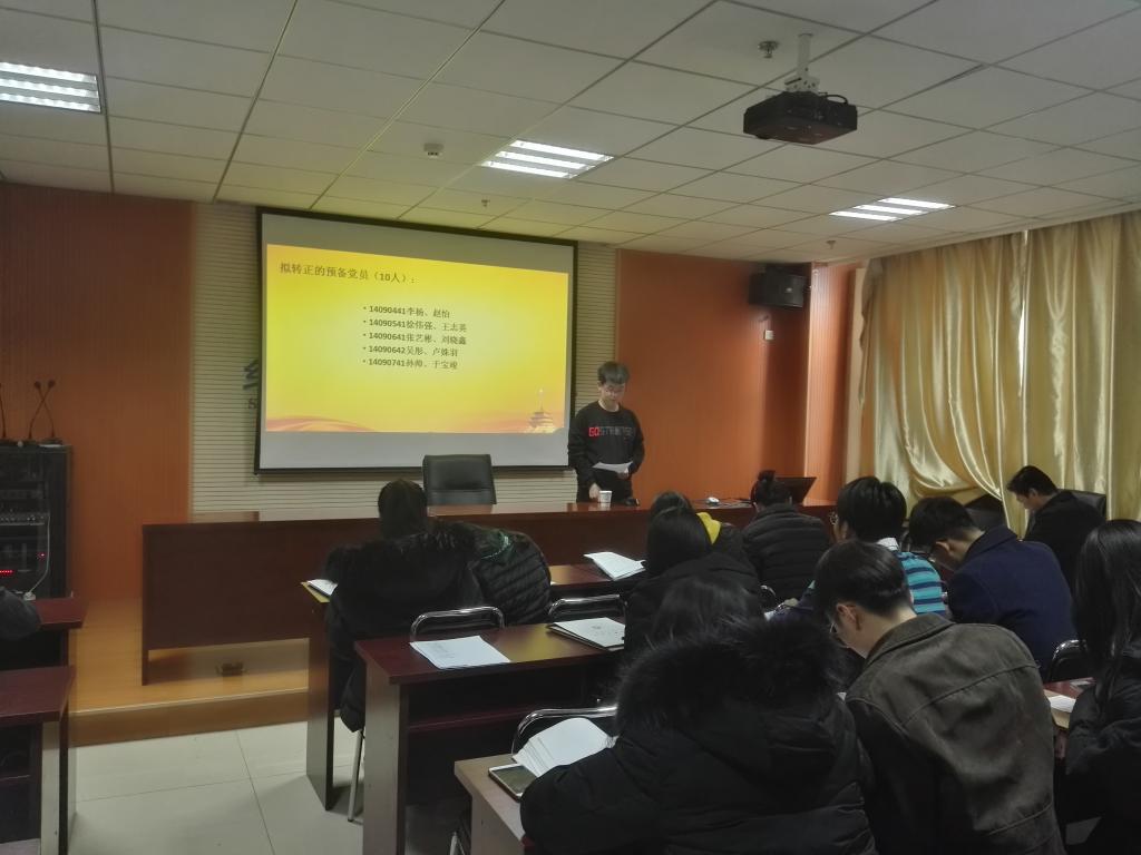 大会开始,首先由那鹏飞老师报告大会应出席和实际出席会议的党员人数,并宣布会议关于预备党员转正、新发展党员的议题和要求,紧接着由本学期要转正的预备党员讲述这一年中自己的情况,向党组织提出转正申请,介绍人进行评价,最后由正式党员投票确定是否转正,有表决权的正式党员对其进行无记名投票表决,一致同意10名预备党员转为正式党员。