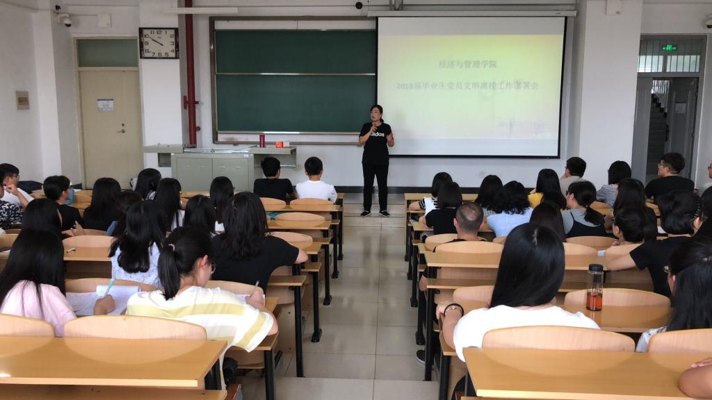 2018年6月19日上午9:30,经济与管理学院组织召开2018届毕业生党员文明离校工作部署会。学生党支部书记李爱霞主持会议,全体毕业生党员参会。
