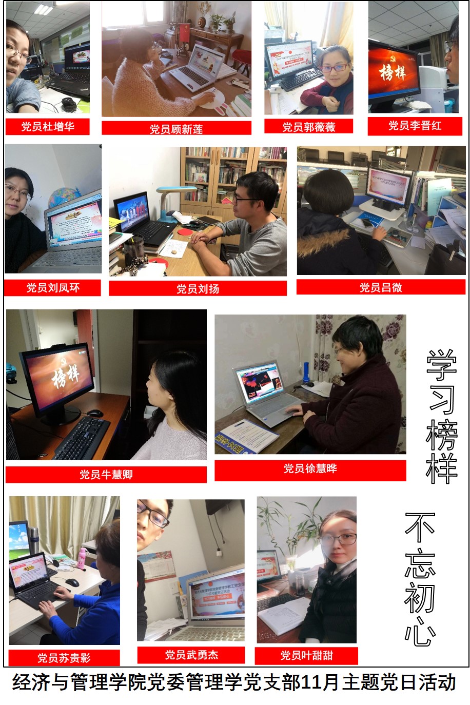 十一月的中北,虽寒风凌冽,但阳光照耀。为弘扬“十九大”精神和弘扬爱国奋斗精神,引导管理学教工党支部积极学习榜样和争做榜样,激发教工党支部所有党员同志的使命感和责任感,发挥党员同志的积极性和模范带头作用。2018年11月11日,中北大学经济与管理学院党委管理学教工党支部组织所有党员自行观看学习支部支委制作的PPT和视频——《榜样的力量》,开展“学习榜样·不忘初心”的学习贯彻“十九大”精神和弘扬爱国奋斗精神的专题党日活动。