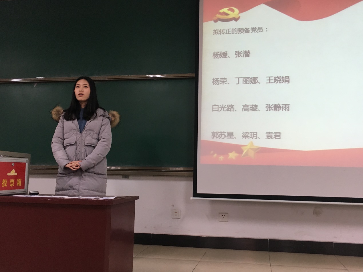 大会开始,首先由李爱霞老师报告大会应出席和实际出席会议的党员人数,并宣布会议关于预备党员转正、新发展党员的议题和要求,紧接着由本学期要转正的预备党员讲述这一年中自己的情况,向党组织提出转正申请,介绍人进行评价,最后由正式党员投票确定是否转正,有表决权的正式党员对其进行无记名投票表决,一致同意杨媛等11名预备党员转为正式党员。