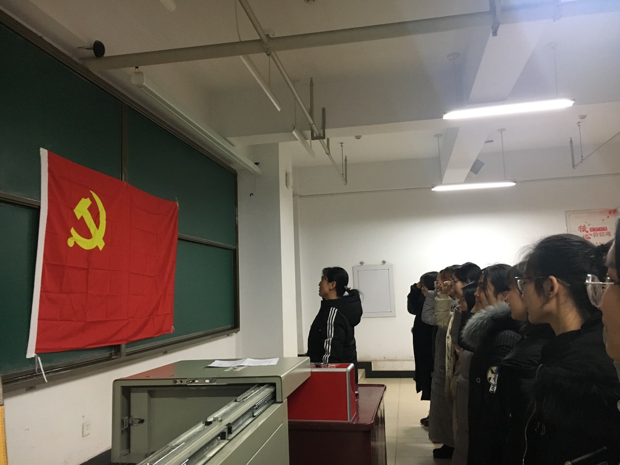随后李爱霞老师带领新发展中共预备党员宣誓,正式党员重温入党誓词,砥砺前行,明确一名党员的权利和义务。