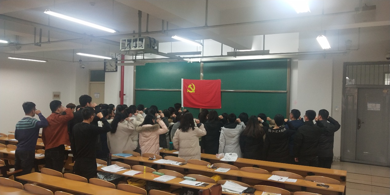 随后那鹏飞老师带领新发展中共预备党员宣誓,正式党员重温入党誓词,砥砺前行,明确一名党员的权利和义务。