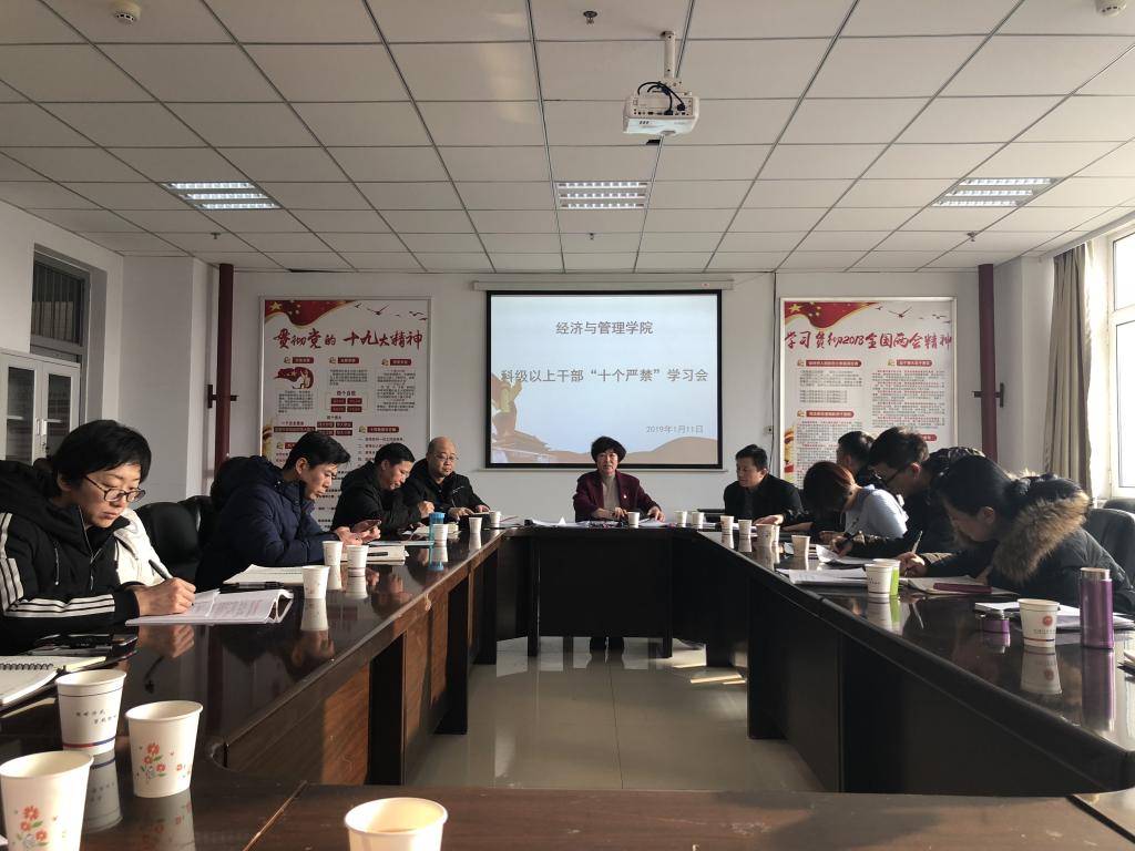 2019年1月11日上午,经济与管理学院在党员之家开展科级以上干部“十个严禁”学习会。校纪委委员原彦飞同志应邀出席会议,会议由院党委书记王琳同志主持,科级以上干部参加。