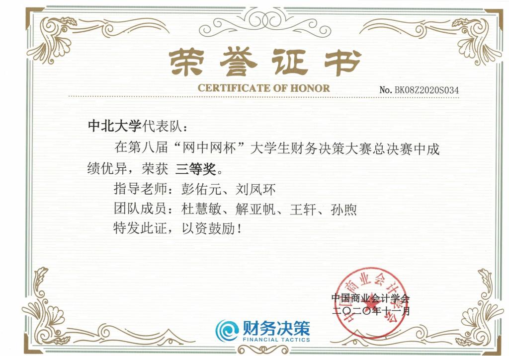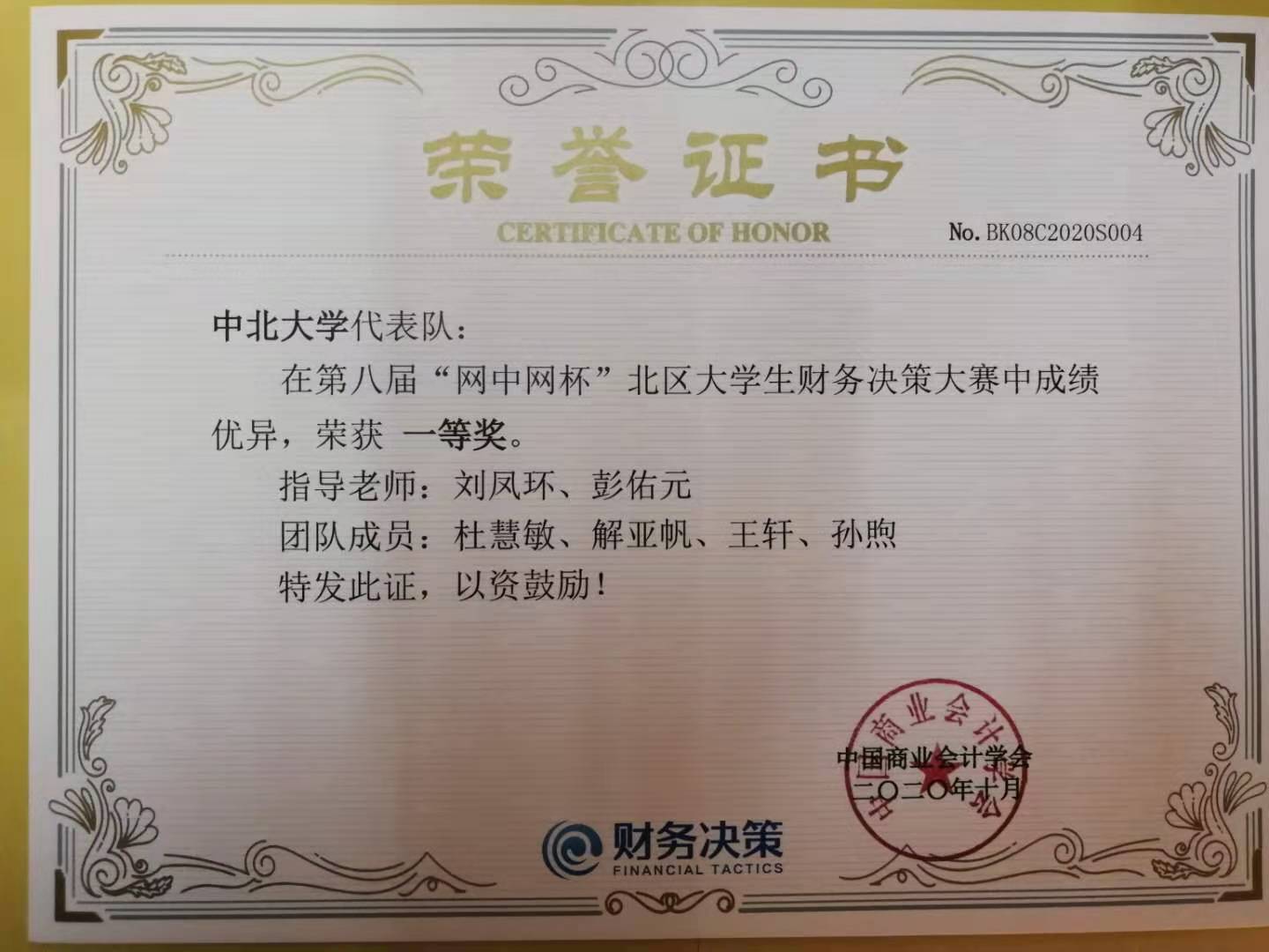第八届“网中网杯”大学生财务决策大赛的校内选拔赛于2020年9月27日在我校举行,比赛在彭佑元老师和刘凤环老师的指导下获得了圆满成功,本次大赛总共有20支队伍报名参加了比赛。比赛旨在锻炼同学们的财务决策能力,提高同学们的实践能力,激发同学们对于经济方面和决策方面的兴趣,提高同学间的合作能力。同学们在比赛中认真讨论,气氛热烈,在此次比赛中都得到了锻炼,也增强了合作能力。经过激烈的角逐,大赛评选出6支获奖队伍,其中一等奖一名,二等奖两名,三等奖三名,获奖名单如下:
