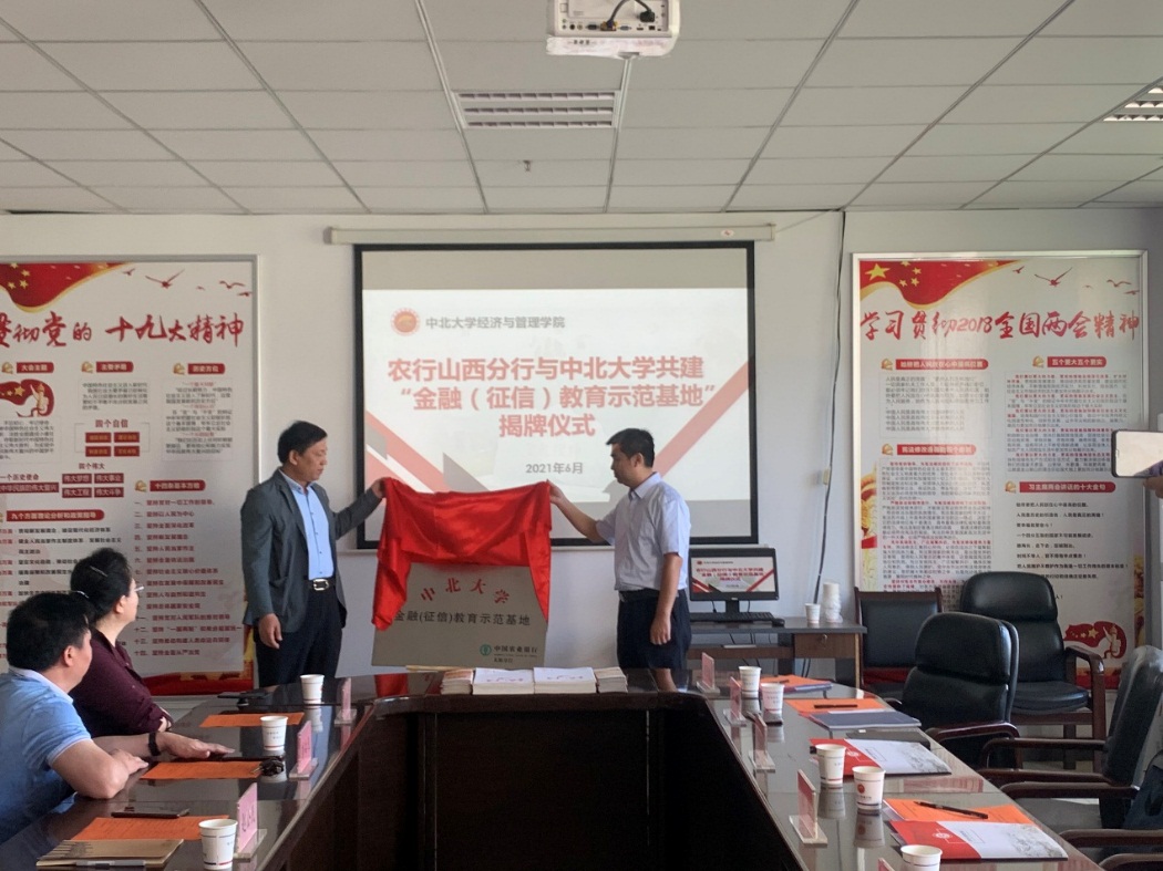 6月10日上午,经济与管理学院在逸夫楼南楼308举办了中国农业银行山西省分行与中北大学经济与管理学院共建“金融(征信)教育示范基地”揭牌仪式。中国农业银行山西省分行信用管理部副总经理祝志敏,中国农业银行山西太原分行党委委员、副行长田华、经济与管理学院党委书记王琳、院长赵公民等出席了仪式,仪式由经济与管理学院党委副书记屈有明主持。
