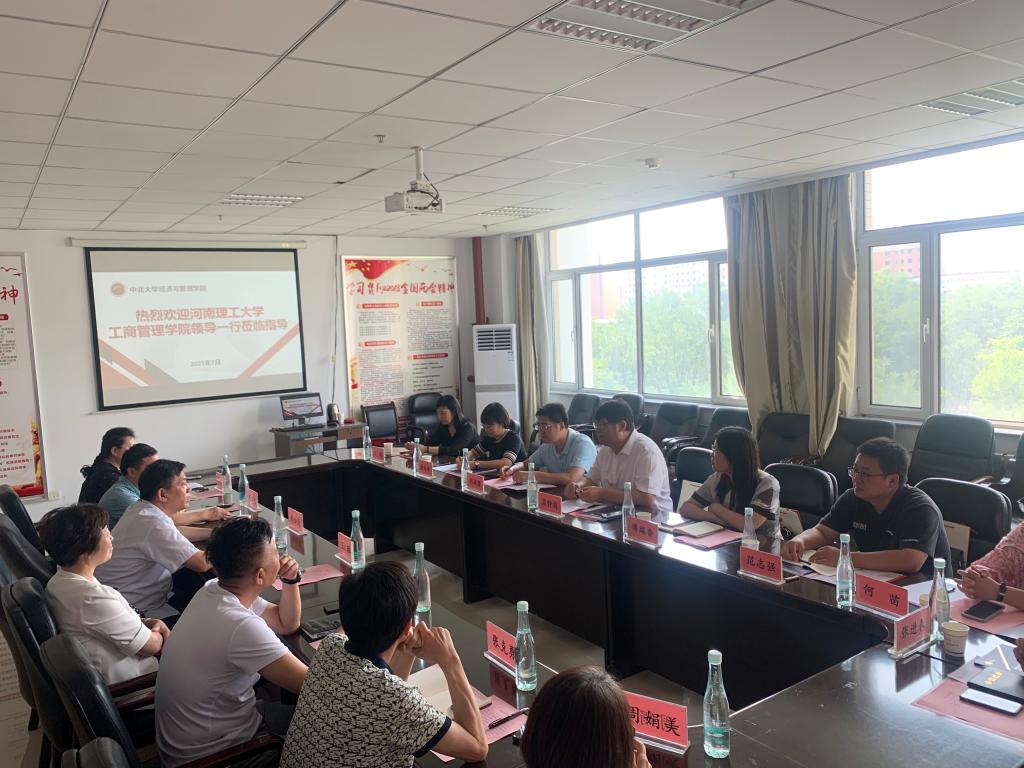 7月6日上午,河南理工大学工商管理学院院长孟钟剑一行来我校经济与管理学院进行调研交流,在逸夫楼南楼308会议室举行了交流座谈会。经济与管理学院党委书记王琳、院长赵公民、院党委副书记屈有明、副院长彭佑元、副院长张克勇、管理系主任李彦华、经济系主任周娟美参加了交流座谈会。