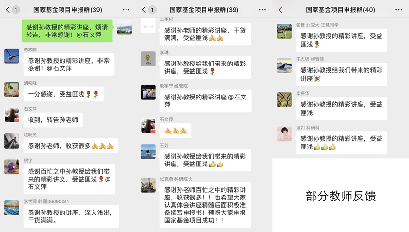 孙教授建议青年博士教师不要盲目追求热点选题,要在博士研究方向和各自擅长的学科专业领域,继续深耕细研、抓住学术前沿,提早做好选题并进入申报书撰写工作,还要精益求精多轮次修改申报书和不耻下问多咨询领域内专家,这样方能做好国家社科基金项目申报工作。通过此次学习,中青年教师对国家社科基金项目选题基本思路、申报书内容的基本撰写方法等有了进一步理解,极大提升了做好科研工作的信心和决心。