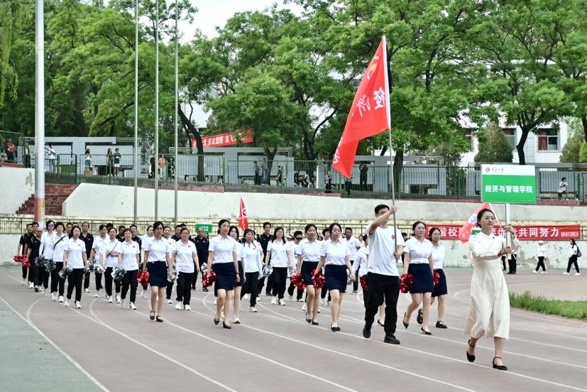 运动会开幕式上,国旗班,院系、部处和直附属单位等分工会的教职工依次列队步入操场接受检阅,我院教师步伐整齐,呼喊着嘹亮的体育精神口号,展现出经管人积极进取、昂扬向上的精神面貌。