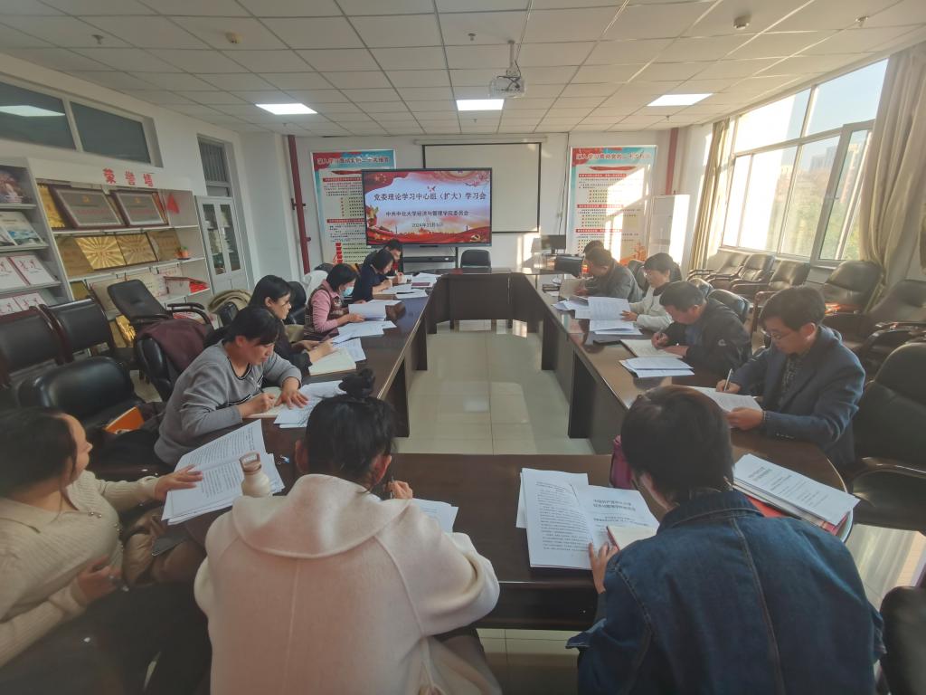11月5日下午,经济与管理学院党委在逸夫楼南楼308会议室召开院党委理论学习中心组(扩大)学习会,学院领导班子、党委委员及各党支部书记参加了本次学习会,会议由院党委书记杜苇同志主持。会议专题学习了习近平总书记近期重要讲话精神,学习了党的二十届三中全会精神,并对巡视工作进行再部署。
