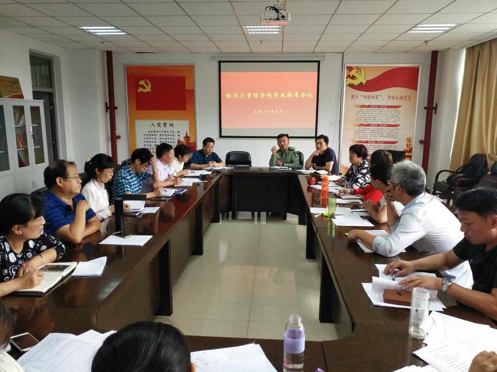 9月5日下午,经济与管理学院在院楼308室召开了本学期首次学院党政联席会议,院党委书记王琳、院长赵公民、院党委副书记屈有明、副院长彭佑元、副院长张克勇,学院各学科部主任、副主任以及学院各科室负责人参加了会议。