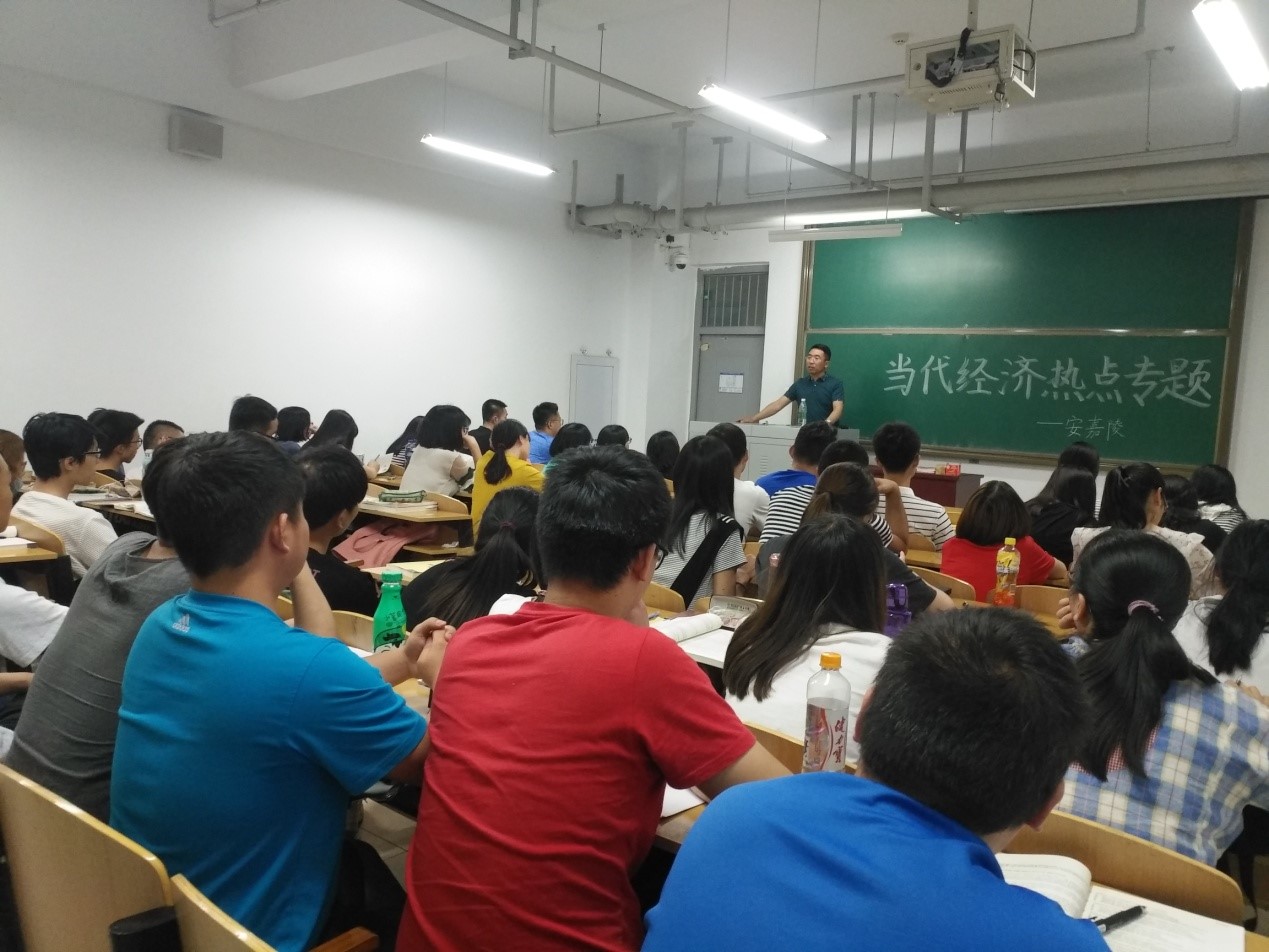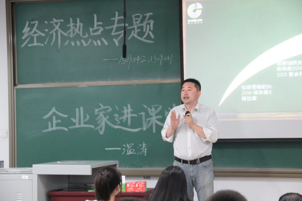 “企业家进课堂”系列活动,是经济学专业近几年坚持校企合作、创新人才培养模式的有力探索。本学期,“企业家进课堂”与专业教师模块化授课方式结合,根植于“当代经济热点专题”的专业课程中持续推进。“当代经济热点专题”是面向15090141、15090142班开设的专业课,除由5位专业教授、副教授分专题模块讲授外,于5月15日和5月23日晚分别迎来了两位企业家按课程既定时间走进教室担任授课讲师,为该课程的“双创专题”添彩。