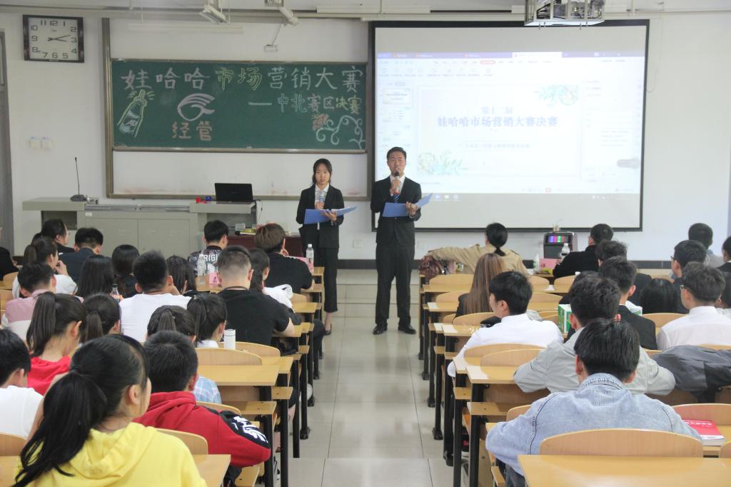 为了锻炼学生的实践能力,帮助学生更好的将理论与实践相结合,经济与管理学院与娃哈哈公司合作,承办中北大学娃哈哈市场营销大赛。经过层层选拔,5月19日下午三点,娃哈哈市场营销大赛决赛于15102教室成功举办。娃哈哈公司张敏总监、魏彦丽女士、我院市场营销专业学生息文凯、梅龙腾担任此次大赛评委。