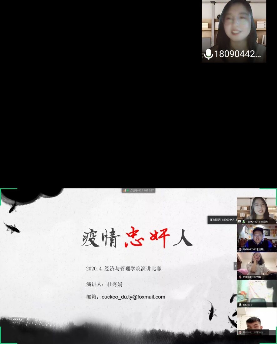 为给经济与管理学院学子提供一个疫情期间所见,所闻,所思,所想的平台,丰富学生疫情期间生活,4月29日晚7点,经济与管理学院演讲协会顺利举行线上疫情防控主题演讲比赛。