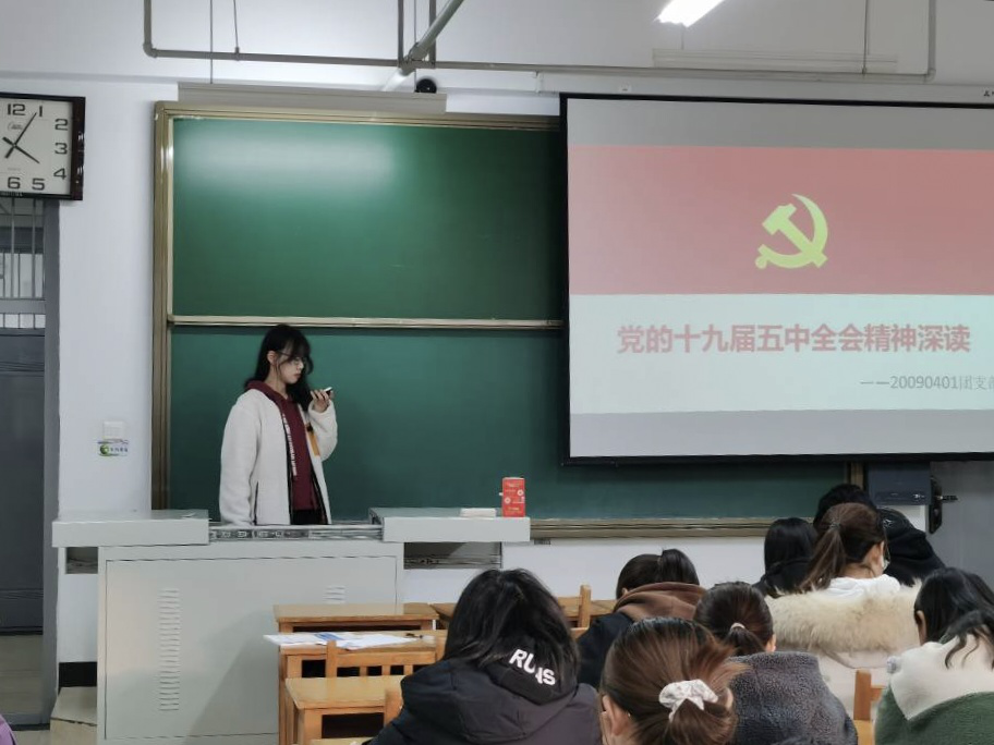 各团支部书记以视频的形式向大家展示十九届五中全会的相关要点,并对会议提出的到二〇三五年基本实现社会主义现代化远景目标以及“十四五”时期经济社会发展主要目标进行基本解读。各支部同学积极参与讨论,踊跃发言,发表自己的看法,进行经验交流,并写下了自己的深切感悟。部分班级的老师对主题班会做了总结,对同学们提出不断努力,砥砺前行,开拓创新的要求。
