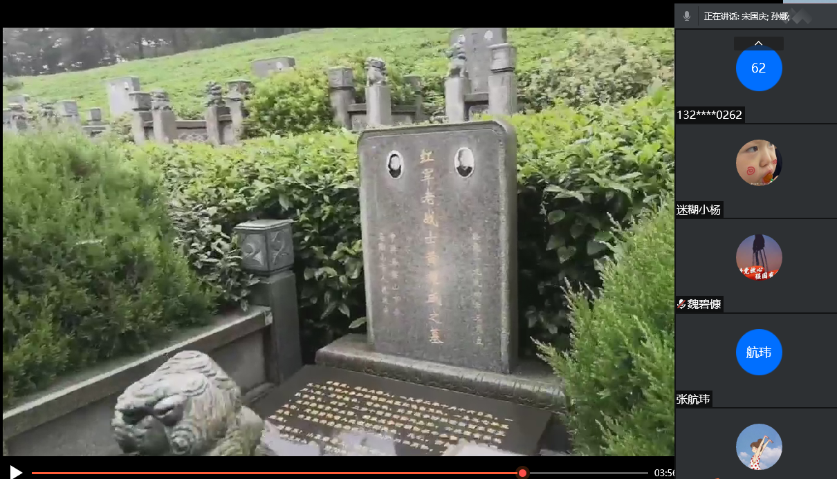 抵达烈士陵园,沿着长长的阶梯向上便能够看到一座高高矗立着的纪念碑,这座纪念碑的修建是为了纪念在渡江战役中牺牲的39位无名烈士。注视着纪念碑、遥想着烈士们当年献身救国的豪情万丈和慷慨激昂。陵园内的革命历史纪念馆陈列着抗日战争时期、解放战争时期的革命烈士英名录、烈士遗物、革命时期的图片、革命斗争史及重大历史事件介绍等。现园区共有烈士墓32座,红军墓18座,纪念碑2座,纪念亭2座,纪念馆1处。实践团团员们跟随孙娜同学,隔着屏幕注视着庄严的墓碑,感受战争所带来的悲痛、体会战士们英勇无畏、保家卫国的决心。
