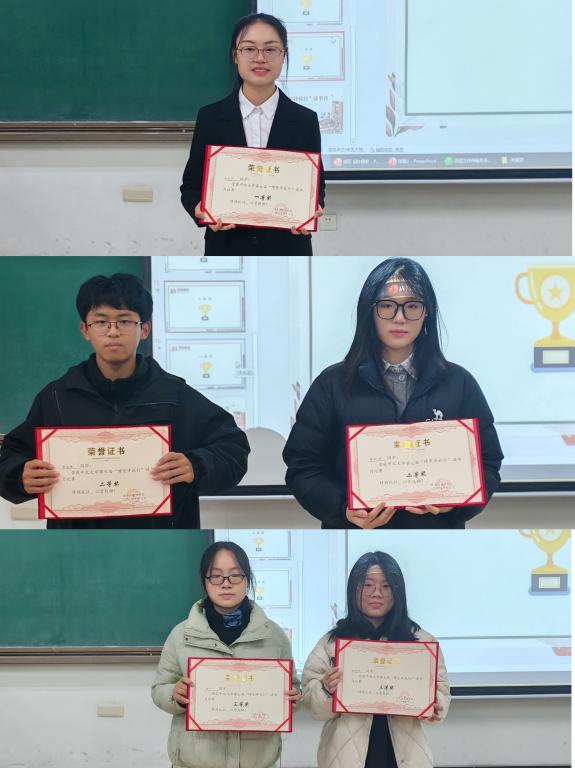 比赛结束后,活动为五位同学颁发奖状。关丽莎同学获一等奖,李涵斌同学与穆佳琪同学获二等奖,熊可同学与赵欣然同学获三等奖。