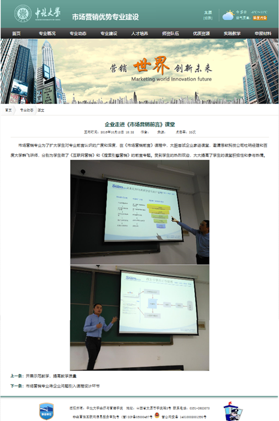 第一,部分专业课程设置了企业家进课堂环节。在专业课阶段,部分实践性较强比如《市场营销学》、《市场营销前沿》、《创业基础》、《营销策划》等课程,由教师和企业有实战经验的专家共同完成。如《市场营销前沿》邀请百度大学讲师和思软公司经理为学生分享“搜索引擎营销”、“互联网营销”专题;《市场营销学》、《营销策划》课程拿出部分内容比如促销计划制定、企业形象策划等由娃哈哈公司营销实战人员讲解;《创业基础》在商业模式、创业资源部分内容邀请创业的校友进行分享和讲解。专业课由企业家和教师共同完成,学生对专业认识能力得到很大提升,创新兴趣大大增加。