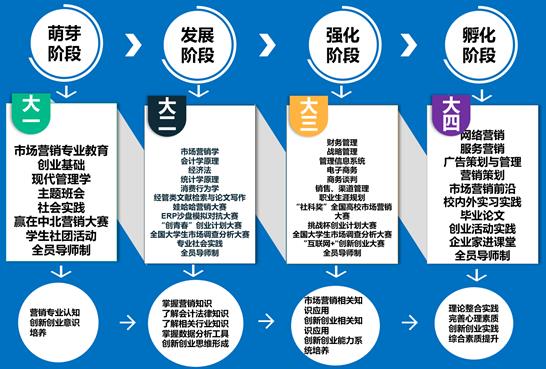 这一人才培养模式的构建分为以下四个阶段:萌芽阶段—培育阶段—强化阶段—孵化阶段。萌芽阶段注重营销专业认知、创新创业意识的培养;发展阶段注重营销知识和数据分析工具的掌握、创新创业意识的形成;强化阶段注重市场营销知识和创新创业相关知识的应用、创新创业意识的系统培养;孵化阶段注重理论整合实践、心理素质完善、综合素质提升和创新创业实践能力提升。具体内容见图1。