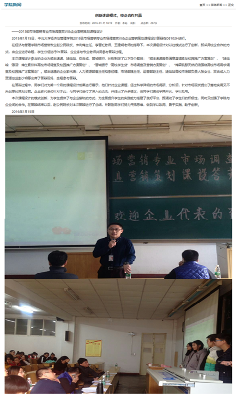 第二,部分实践教学环节由学校和企业共同完成。《市场调查实训》、《营销策划课程设计》与顺丰、双合成、娃哈哈、蓝月亮等企业共同完成。课程设计之前要求企业将自己的实际问题作为课程设计题目,每个题目有三到四个小组进行PK,要求指导教师与企业导师共同指导,学生到企业实地走访、调研、获取资料,答辩环节由校企双方共同完成,优胜队将获得企业发放的奖品,极大地提高了学生兴趣,提升学生的创新能力。
