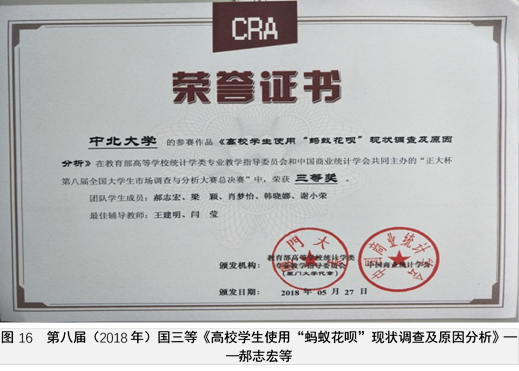 2018年,在“互联网+”大学生创新创业大赛,市场营销专业学生积极参与,且多为项目主要负责人(表中“责任人”项和“成员”项中用红色字体标识)。在市场营销专业教师(表中“指导教师”项中用红色字体标识)的指导下,各参赛项目获省级一、三等奖分别为7项和2项,校级一、二、三等奖分别为4项、7项和11项,校级优秀奖3项。各项目获奖情况见表16。