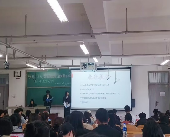首先,在场人员共同奏唱共青团团歌。答辩顺序已经由提前抽签决定,大二团支部首先进行答辩,答辩过后现场人员通过扫描屏幕上的二维码对喜爱的团支部进行线上投票,投票过后组织部成员带来了舞蹈表演,缓和现场紧张的气氛,接下来大一团支部继续进行答辩。在整场过程中,各支部播放精彩的团日活动视频,展示创新的活动方式,拉票环节的新颖形式更是点燃了全场气氛。最后组织部成员以舞蹈和合唱节目为结尾,顺利结束了“学习二十大,永远跟党走,奋进新征程”团日活动答辩比赛。