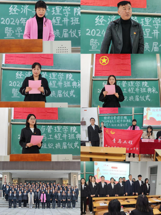 11 月 9 日 8点,经济与管理学院 2024 年青马工程培训班开班典礼暨学生组织换届仪式于 15208教室举行。院党委书记杜苇、院党委副书记屈有明、学生科科长李爱霞、团委副书记叶甜甜出席大会,85位团学骨干参加,会议由买璐璐老师主持。