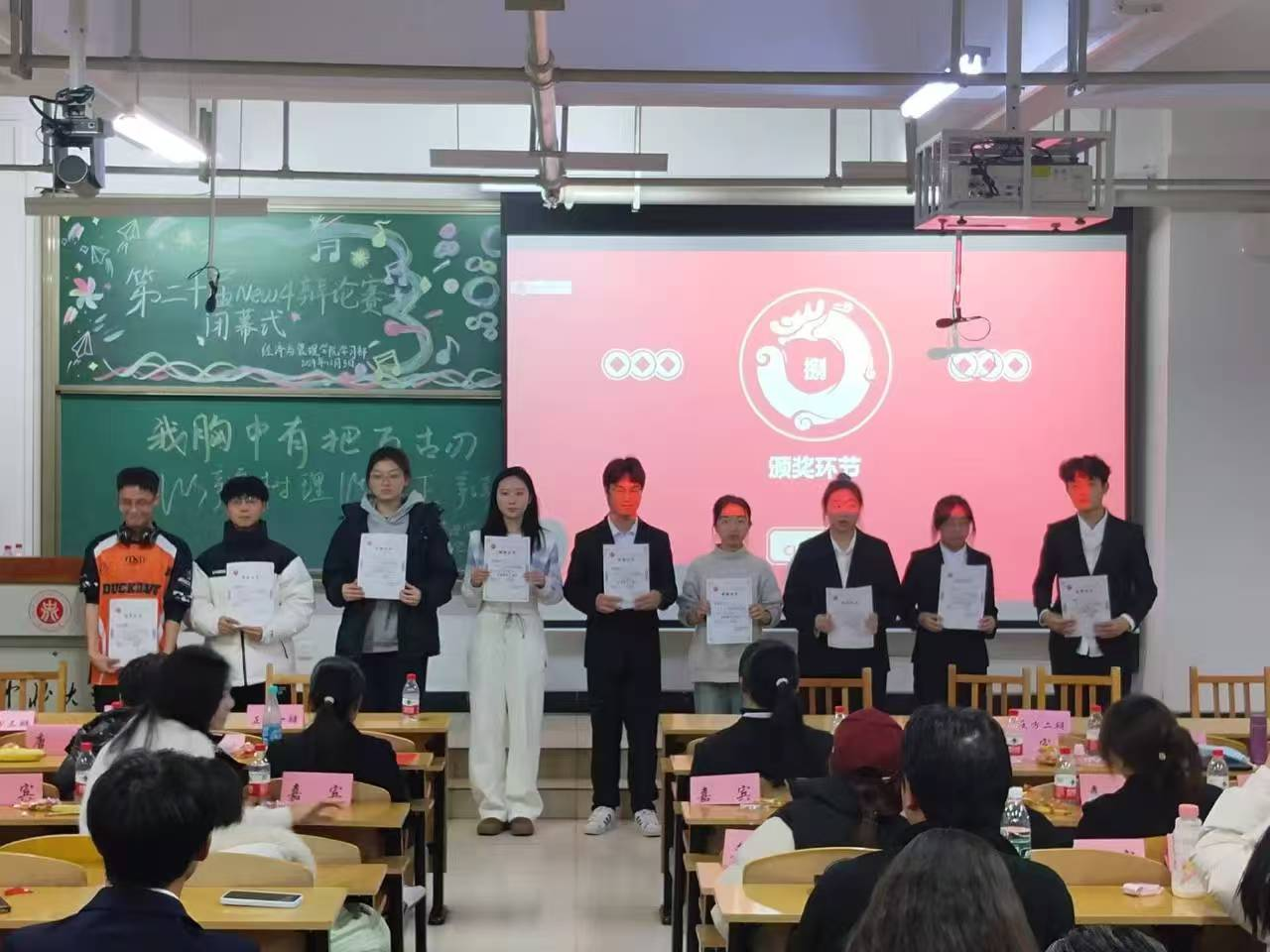 在闭幕式上,24090441班、24090241班、24090341班及24090342班的代表分别进行了团队介绍,充分展示了各参赛队伍的精神风貌和辩论实力。随后,24090441班与24090342班就“拥有执念是人生之喜还是人生之悲?”这一紧贴时代脉搏的话题展开辩论,而24090341班与24090241班则围绕“驱动自我的善念和制约自我的恶念,何者更难?”这一深刻辩题进行了激烈的辩论。经过一系列精彩的比拼,各参赛队伍的比赛名次得以揭晓。
