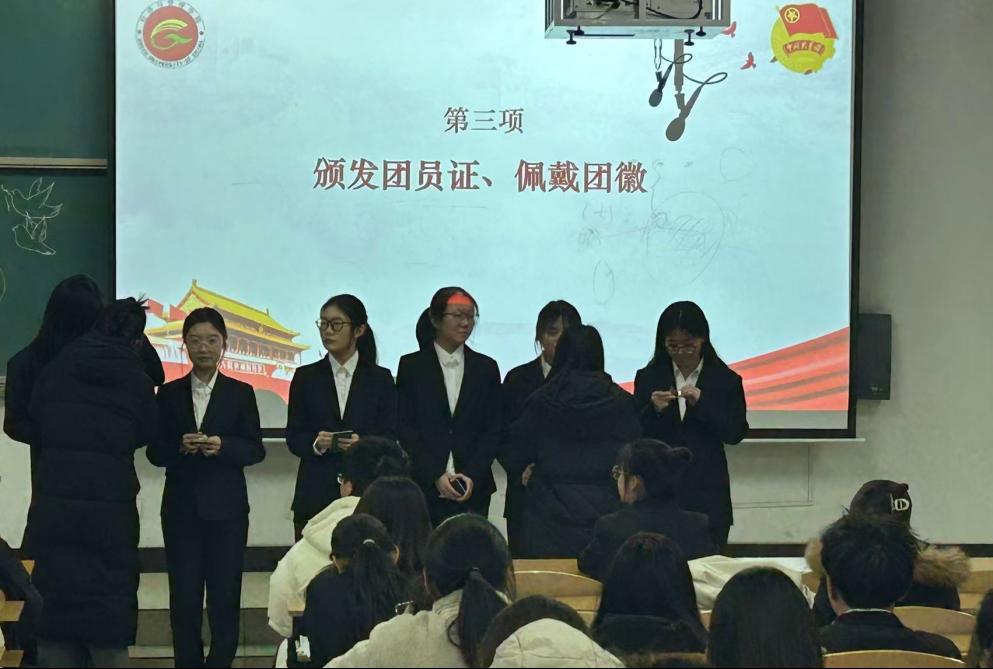第三项议程,颁发团员证、佩戴团徽。由团员代表为新团员们颁发团员证和佩戴团徽。团员证是一份认可,更是一份对未来的期许;团徽在灯光下闪烁着璀璨的光芒,承载着对新一代青年的期望,是青春路上的灯塔,指引着新团员们前行的方向。