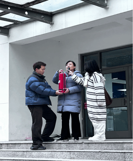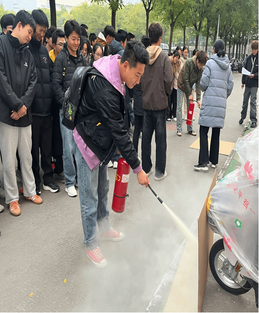 当急促的口哨声划破校园,学生们在学院安全员的引导下,用湿毛巾捂住口鼻,弯腰低姿,沿着预设逃生通道快速且有序地疏散至指定集结点。在实战处置区,现场搭建模拟火情场景下,老师以班级为单位开展灭火器一对一实操考核,从提、拔、握、压四个动作细节逐一指导,确保学生精准掌握灭火技能。