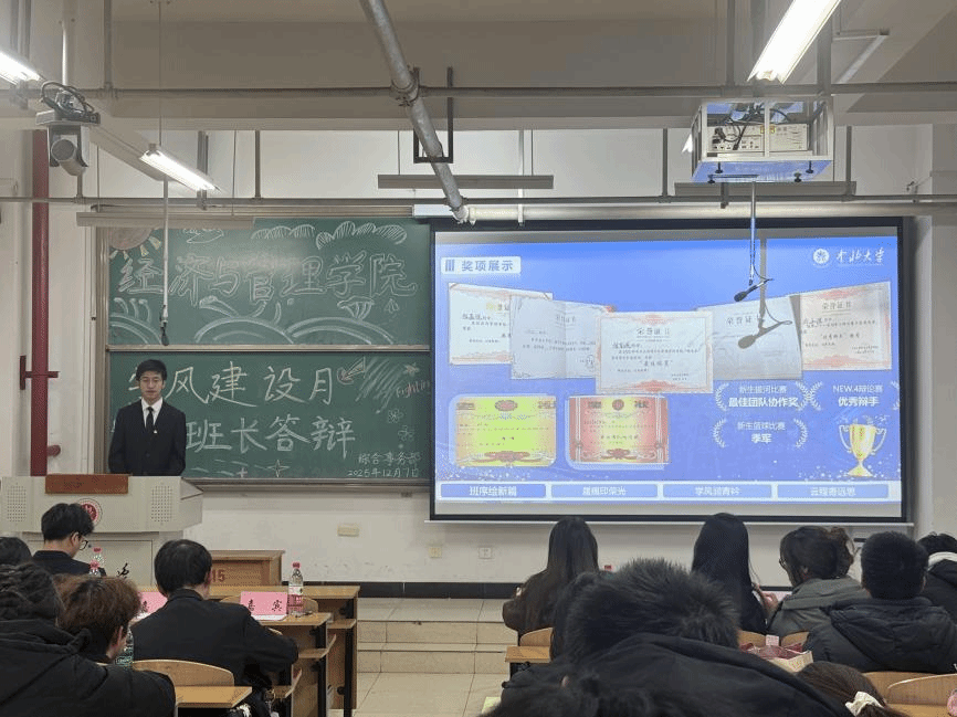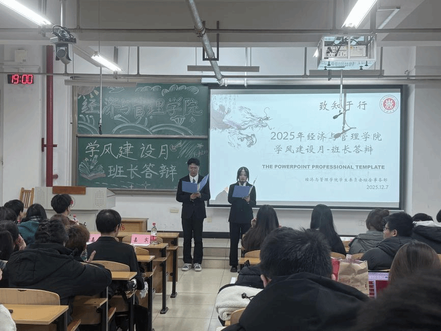 为推进学风建设,营造比学赶超、求真务实的育人氛围,经济与管理学院在学风建设月组织25级12个班级开展系列特色学风活动,并于2025年12月7日举办班长答辩活动暨优良学风班评比。