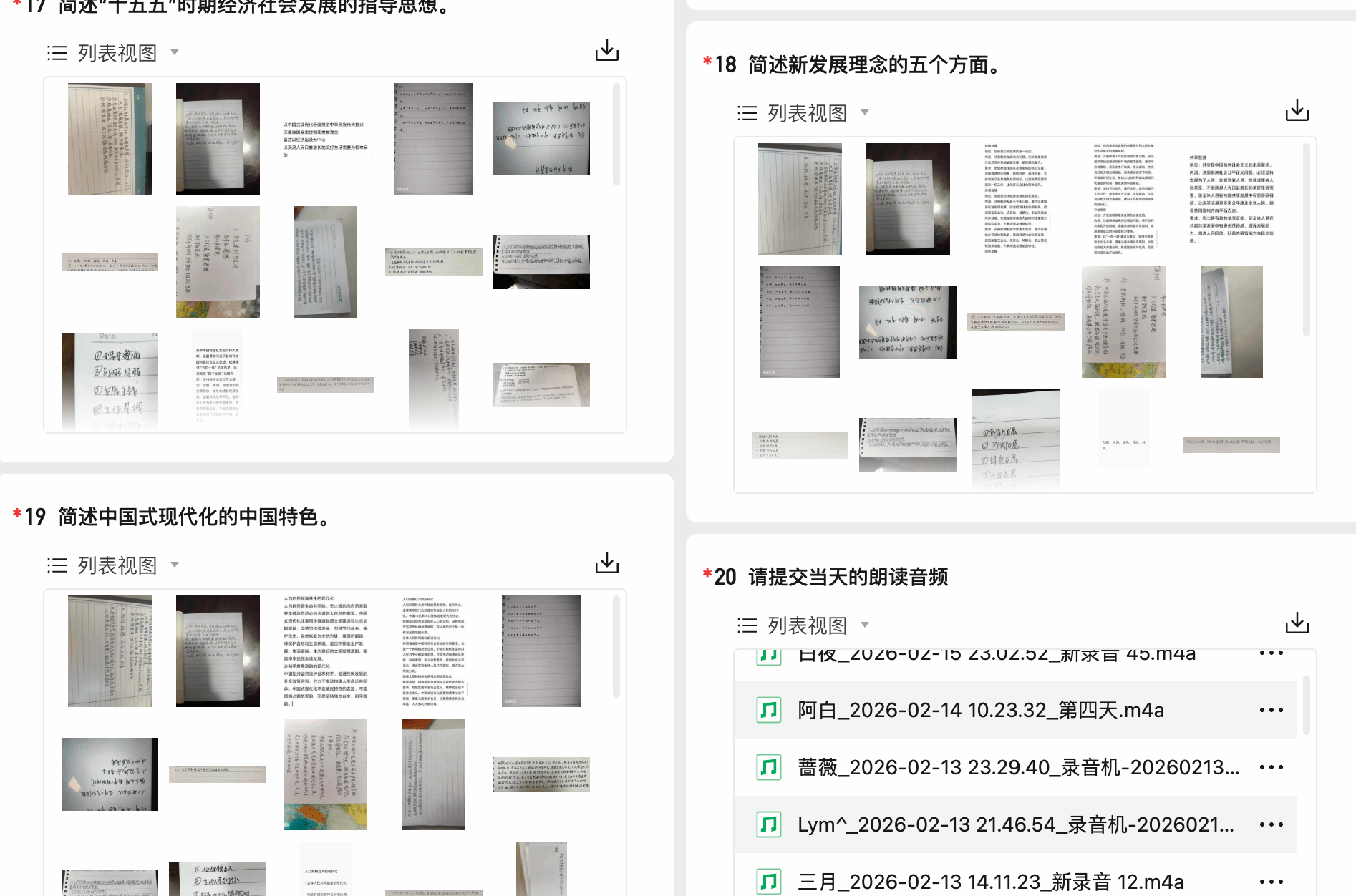 学习内容紧扣《中北大学学生干部应知应会知识清单》,围绕"十五五"规划建议、党的二十届四中全会精神、团章团规及习近平总书记关于青年工作的重要论述,配套发布200余道理论测试题目、10份专项学习材料。学习形式坚持"朗读+摘抄+答题"三位一体,每日要求朗读3-5分钟、手写摘抄不少于200字,累计收集朗读录音1500余份、手写笔记4000余份,形成完整的学习轨迹与过程性档案。