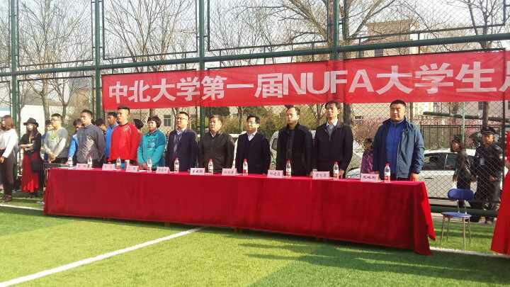 本次足球联赛开幕式在西区足球场举行,中北大学副校长白培康、曾建潮、中北大学学生处处长邱建国等相关领导,以及裁判员、球员代表出席了开幕式。