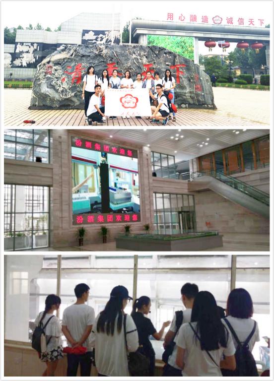 随后由事先联系好的负责人带我们进入集团内部进行参观。在负责人的带领下我们进入生产车间,隔着玻璃我们可以看到酿造车间内工人有条不紊地工作着,经过发酵、打碎、碾细、过筛、流酒等一道道传统工艺与现代化机械设备的结合,酿造出具有特色清香文化的汾酒。包装车间内工人着装统一,设备规模宏大,各环节有序衔接——白酒分类装瓶、装箱、封箱,全自动化的包装过程让我们不禁感叹。在与负责人的交谈中我们得知汾酒集团已被授予“中国企业文化示范活动基地”,全国绿色环保先进企业,“中国最具影响力企业”,“全球百佳儒商企业”等多项荣誉称号,同时在参观汾酒集团时我们也感受其有序经营管理模式和精湛成熟的制酒技艺。