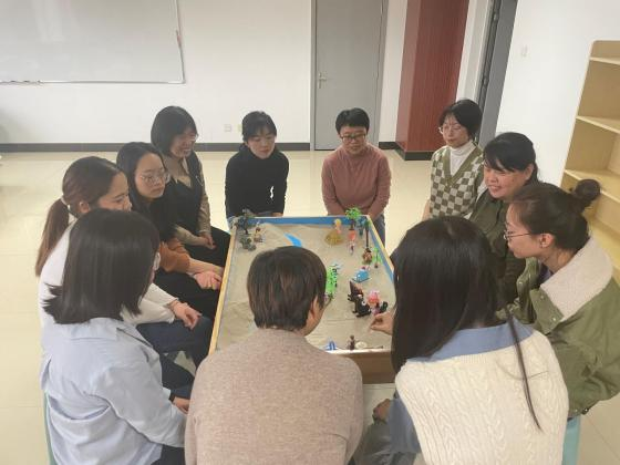 每期的沙盘成长小组中,带领者以荣格分析心理学原理为理论基础,陪同团体中的成员通过沙具、沙盘等来呈现小组成员所感受和体验到的、语言无法描述的内在世界,并且在安全的小组氛围内进行分享和讨论。在高校中,学生的心理困扰大多围绕着人际关系和自我成长展开,因此使得团体沙盘游戏逐步得到了重视。本次沙盘小组中,带领者结合大量实际案例,为各位辅导员呈现如何将沙盘游戏这种学生较感兴趣的方式运用在辅导员谈心谈话、宿舍人际交往、选拔学生干部及课堂教学中。
