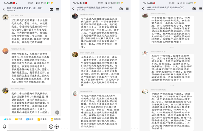 最后,每位党员以党小组为单位依次进行讨论,就学习“喜迎二十大,奋进新时代”发表个人感想,交流心得与体会。