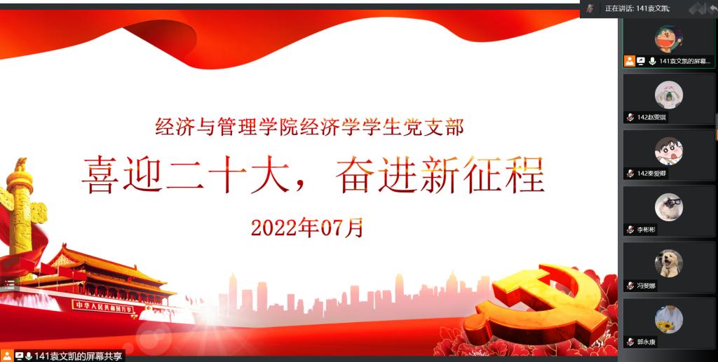 2022年7月1日,为庆祝中国共产党成立101周年,更好迎接党的二十大召开,经济学学生党支部开展主题为“喜迎二十大,奋进新时代”的线上主题党日活动。本次活动由袁文凯同志主持,党支部全体党员参加。