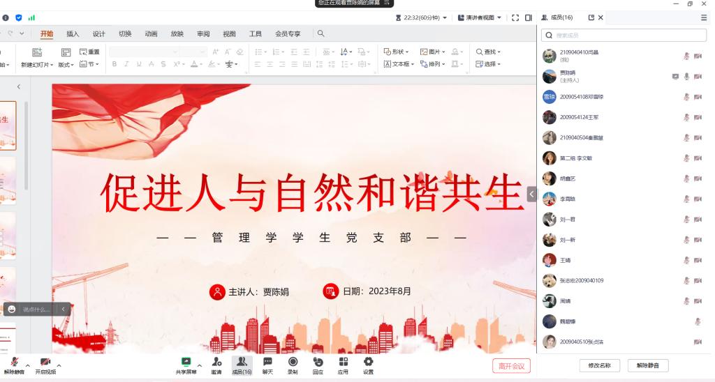 为扎实推进学习宣传贯彻习近平新时代中国特色社会主义思想主题教育,2023年8月14日下午,经济与管理学院管理学学生党支部举办了以“促进人与自然和谐共生”为题的专题党课,本次活动由贾陈娟同志主讲,管理学学生党支部全体党员参加。