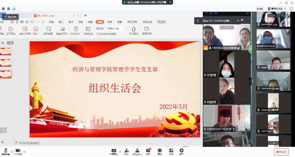 2022年3月1日,管理学学生党支部召开了2021年度组织生活会和党员民主评议会议,此次会议以线上形式开展,会议由支部书记那鹏飞同志主持,管理学学生党支部全体党员参加。
