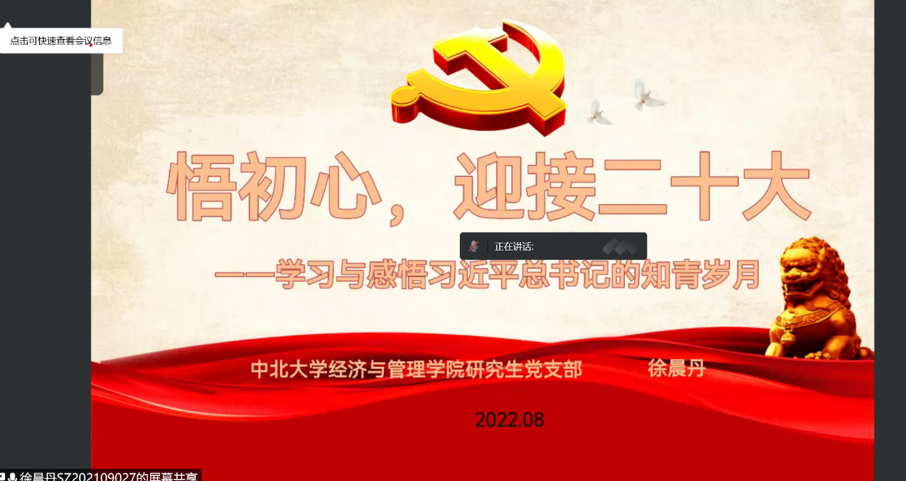 2022年8月22日,经济与管理学院研究生党支部全体党员在线上学习习近平总书记的七年知青岁月,走进了习近平总书记下乡的那段时光,让我们更加全面、历史地了解习近平总书记的过去和现在,更加深刻的体悟到了习近平总书记所有行动的深远初心。本次会议由研究生党支部书记屈有明主持,徐晨丹同志主讲,全体研究生党员参加。